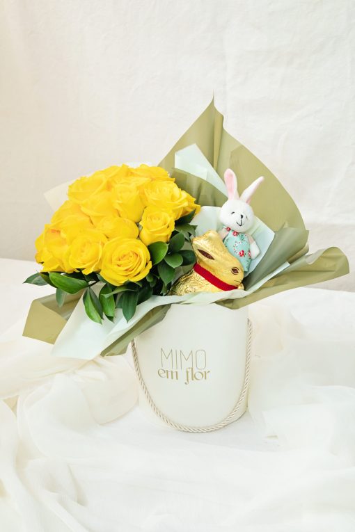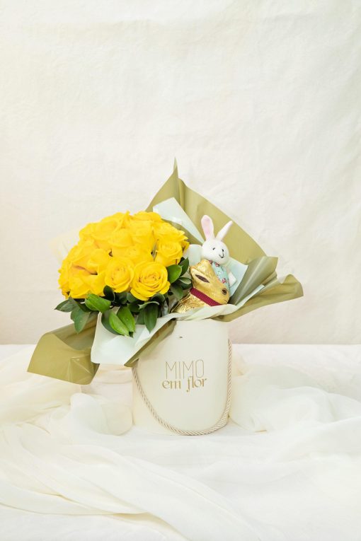 Buquê de rosas amarelas na nossa box marfim + 1 coelho de chocolate Lindt + 1 coelho de tecido.