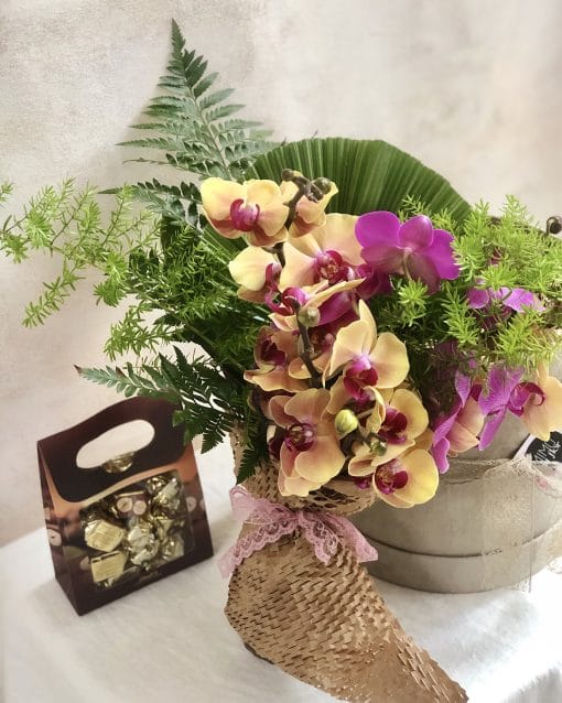 Box redonda camurça com buquê de orquídeas e bombons chocolate Lindt.