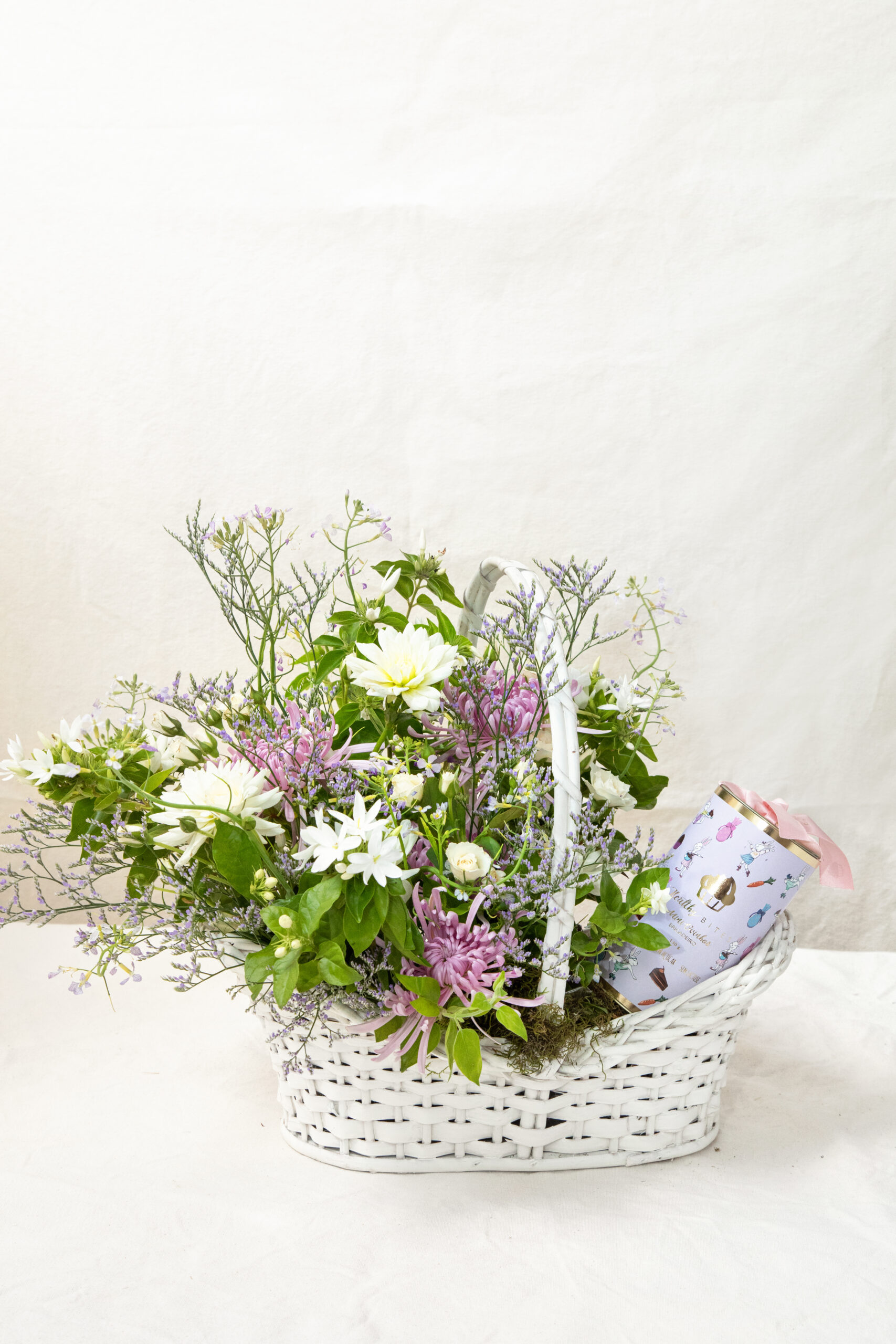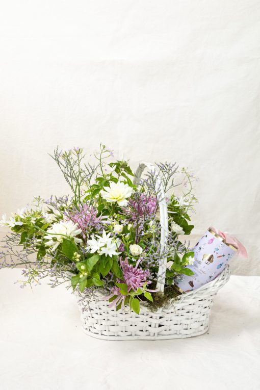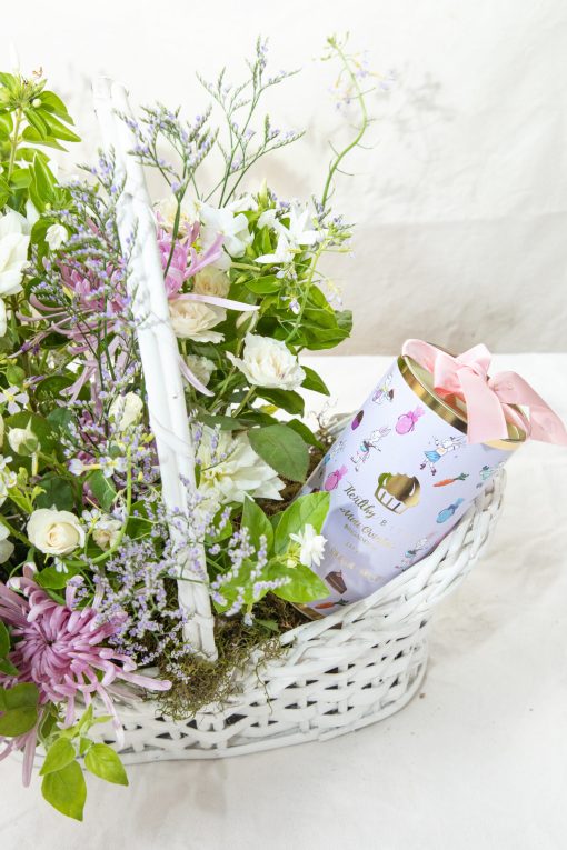 Lilás, branco e verde se combinam de forma harmoniosa nesta cesta de Páscoa, que vem com uma lata 130g de miniovos recheados de doce de leite.