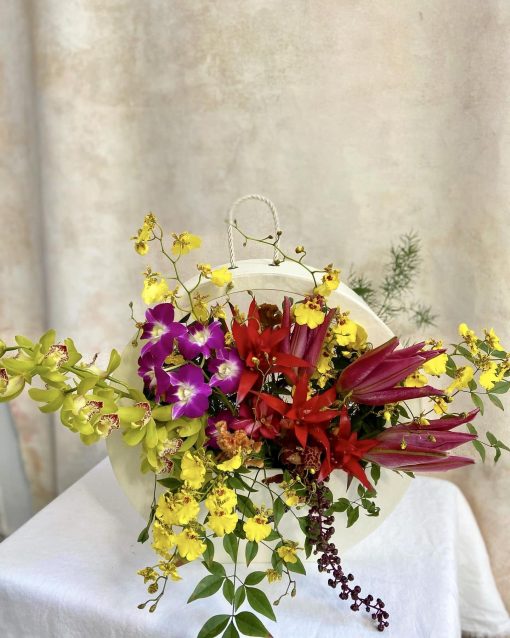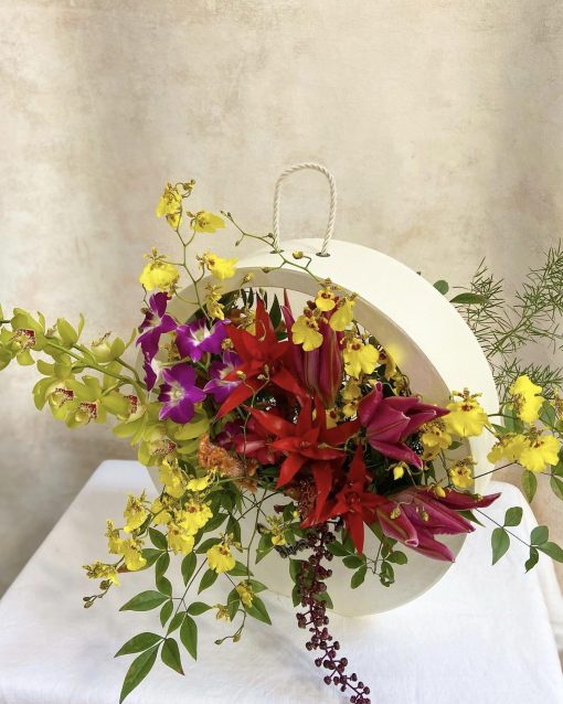 Bolsa redonda off-white com arranjo vibrante de lírios e orquídeas.