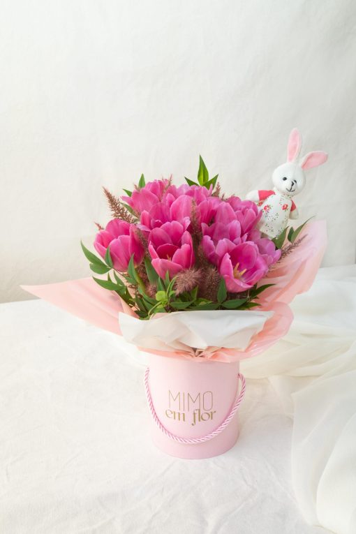 Arranjo de tulipas pink em box de flores rosa bebê. Vem com um coelhinho junto – uma fofura só!