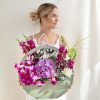 Do lilás ao fúcsia, este arranjo floral leva horênsia, boca-de-leão e orquídea como espécies principais. Feito em bolsa redonda vazada para os dois lados (39cm de diâmetro)