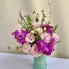 Box pétit tiffany com arranjo em rosa claro e fúcsia. Orquídeas e lisianthus.