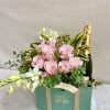 Arranjo de rosas em rosa claro, eucalipto ou outra folhagem delicada com 1 garrafa de espumante Chandon 750ml.