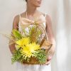 Arranjo floral de anastácia amarela, sementes e capinzinho + 1 caixa de bombons Lindt sortidos (75g) em uma cesta charmosa.