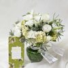 Para quem procura um verdadeiro mimo para presentear. Este vaso de vidro leva lisianthus branco, hortênsia broto e erigyum. Em volta, uma fita de renda dá o acabamento delicado. Acompanha 1 barra de chocolate belga recheado com brigadeiro de pistache da Carmella Patisserie.
