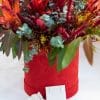Box camurça cereja G. Arranjo em vinho e tons de vermelho com espécies no estilo tropical-chique. Acompanha um par de brincos minimalistas de prata da designer Viviana Terra (@vt_vivianaterra, no Instagram).
