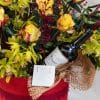 Kit Box Camurça Cereja GG. Arranjo em tons de amarelo, laranja, vinho e verde com rosas especiais e orquídeas + Vinho Tinto 750 ml Tucapel Reserva. Acompanha um par de brincos minimalistas de prata da designer Viviana Terra (@vt_vivianaterra, no Instagram).