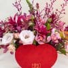 Box em formato e coração em camurça cereja. Arranjo com orquídea, lisianthus e broméria. Acompanha um par de brincos minimalistas de prata com banho de ouro 18K da designer Viviana Terra (@vt_vivianaterra, no Instagram).