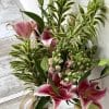 Buquê em tons de pink e rosa, com lírios, boca de leão e pleomele. Acabamento em juta.