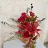 Buquê em tons de vermelho, com lírio, dália, groselha e complementos e eucaliptos.