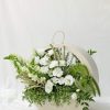 Um modelo exclusivo de box: em formato de bolsa, ela é vazada, com arranjo para os dois lados. Vem com lisianthus, cravinas, aspargus, nandina e sementes.