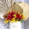 Latâneas secas e douradas, lírios vermelhos, orquídeas, chuva de ouro e complementos secos.