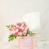 Buquê de três tipos de rosa em tons de pink e rosa claro com nandina na nossa box rosa bebê.