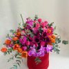 Box de camurça cereja com arranjo vibrante de callas, tulipas, celósia.