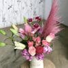 Lírios, rosas, cravinas, rosas spray, dianthus, verônicas e plumas em tons de rosa e pink.