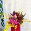 Lírios, pink e marsala e orquídeas chuva de ouro.