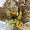 Latânias secas e metalizada, cymbidium laranja e verde, mediante disponibilidade dos tons, sementes e folhagens.
