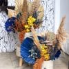 Latânias secas e marinho, plumas capim dos pampas, cymbidium amarelo ou verde, amaranthus e complementos laranja e marinho.