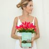 Arranjo de gloriosas em box tiffany. Na gavetinha, arranjo de suculentas.