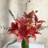 Arranjo em vermelho e verde, com lírios e eucalipto. Acabamento: cilindro forrado.