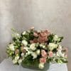Arranjo em tons de branco e pêssego com orquídeas, rosas, cravinas, sementes e folhagens.