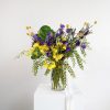 Cilindro de vidro M com arranjo em tons de roxo e amarelo
