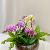 Arranjo plantado em vaso estilo bowl de vidro. Contém 5 hastes de miniorquídeas em dois tons e asplênio no acabamento.