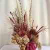 Arranjo perene, de espécies SECAS, em vaso cereja. Contém hortênsia desidratada, urucum, minileques, plumas, sementes.