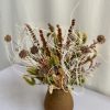 Arranjo perene, de espécies SECAS, em vaso de vidro âmbar fosco.
