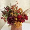 Este arranjo mistura espécies frescas e secas. Contém hortênsia desidratada e orquídea fresca.