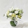 Para quem procura um verdadeiro mimo para presentear ou decorar a casa. Este vaso de vidro leva lisianthus branco, hortênsia broto e erigyum. Em volta, uma fita de renda dá o acabamento delicado.