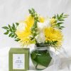 Branco e amarelo: quem aí também adora essa combinação de flores? Este vaso de vidro vem com a vela perfumada Flor de Laranjeira (190g) da L’envie – um dos best-sellers da marca. No mix floral, rosa e anastácia aparecem como protagonistas.